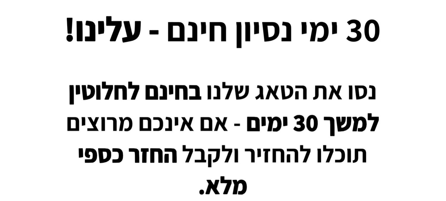 • עד 30 ימי ניסיון מלאים – זמן אמיתי להשתמש במוצר, לבדוק אותו ביום-יום ולהחליט אם הוא מתאים לך.